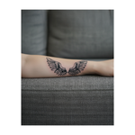 Deux grandes ailes de plumes déployées, à la fois puissantes et légères. Ce tatouage audacieux de style tribal évoque la liberté, l'envol et l'espoir, comme prêt à élever quelqu'un vers le ciel.
