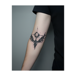 Un tatouage tribal représentant des ailes de feu déployées sous un soleil éclatant aux rayons acérés. Il dégage une impression de puissance et d'audace, comme un gardien surgissant des flammes pour protéger la lumière.