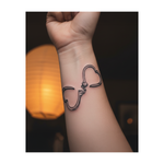 Un tatouage minimaliste représentant deux menottes ouvertes en forme de cœur. Il raconte une histoire d'amour à la fois ludique, symbole de lien et de liberté, mêlant romantisme et style audacieux et avant-gardiste.