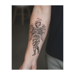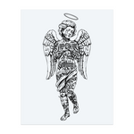 Un tatouage de style chicano représentant un ange en pleurs, ailé et auréolé, le corps recouvert de lettres cursives en gras. Il raconte une histoire de chagrin, de foi et de protection, mêlant beauté et douleur.