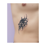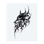 Deux têtes de loup, l'une vivante et féroce, l'autre un crâne, sont liées par des lignes tribales acérées. Ce tatouage symbolise la vie et la mort comme des jumeaux sauvages, emplis d'une puissance brute et d'une énergie sombre.