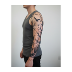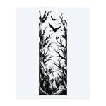 Des arbres tordus s'élèvent sous une lune pâle tandis que des oiseaux noirs volent dans la nuit. Ce tatouage noir capture une forêt hantée pleine de mystère et de murmures.