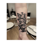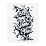 Un tatouage noir et blanc effrayant représentant une maison hantée construite sur un tronc d'arbre étrange. La maison est tordue et ornée de nombreux yeux effrayants, ce qui lui confère un style à la fois ludique et effrayant.