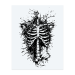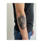 Une cage thoracique éclate, se fissure et des racines s'enfoncent dans les os. Ce tatouage noir représente le mélange de liberté et de décadence, comme la vie qui tente de surgir de la coquille vide de la mort.