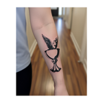 Un tatouage audacieux en noir et blanc représentant une colombe portant un rameau d'olivier, s'élevant d'un calice. Il raconte une histoire d'espoir, de paix et de foi, symbolisant la lumière et le renouveau même après l'épreuve.