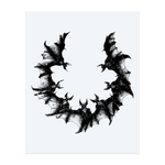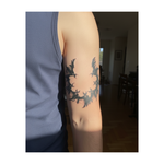 Un cercle de chauves-souris en vol forme un croissant sombre dans le ciel nocturne. Ce tatouage noir évoque le mystère, le mouvement et la magie de l'air au clair de lune.