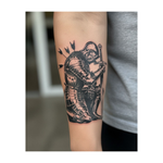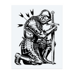 Un tatouage audacieux en noir et blanc représentant un chevalier en armure agenouillé, une épée à la main et des flèches plantées dans le dos. Il symbolise le courage, le sacrifice et l'honneur, et raconte l'histoire d'un combat qui se poursuit même blessé.