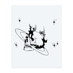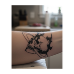 Un tatouage audacieux représentant un crâne enflammé entouré d'un anneau planétaire, flottant parmi les étoiles. Il mêle espace et obscurité, racontant une histoire de mystère et de feu dans un univers infini.