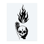 Une main de squelette tenant un crâne effrayant. Une flamme sinistre brûle au-dessus, dans un style mystérieux et inquiétant, idéal pour un moment macabre.