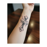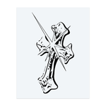 Une croix audacieuse aux bords rugueux, évoquant la pierre, brille d'un éclat intense en son centre. Ce tatouage symbolise la foi et l'espoir, rayonnant avec force dans un style tribal authentique.