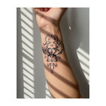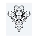 Un tatouage en noir et blanc représentant trois visages : un au centre avec un croissant de lune, et deux sur les côtés. Des formes fluides les entourent, racontant une histoire d’équilibre, de mystère et de la magie de la nuit et des rêves.