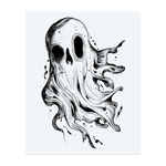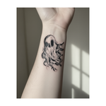 Un fantôme tourbillonnant avec un crâne effrayant en guise de visage. Son corps, fait d'un tissu fluide, flotte dans l'air, parsemé de taches. Ce tatouage noir et blanc, dessiné à la main, dégage un style désordonné, à la fois effrayant et amusant.