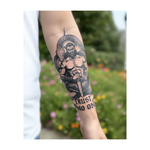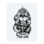 Un guerrier puissant, coiffé de cornes, tient une épée, tandis qu'un serpent géant l'entoure. L'inscription « Ne fais confiance à personne » figure en dessous. Ce tatouage, au style gothique audacieux, symbolise la puissance, le danger et la prudence.