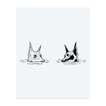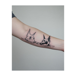 Un tatouage tribal représentant deux têtes de chacal émergeant de l'eau, l'une vivante aux yeux expressifs, l'autre un crâne. Il symbolise l'équilibre entre la vie et la mort, veillant sur ces deux mondes.