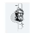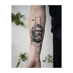 Le visage d'un homme barbu, dessiné de larges lignes noires, se tient à côté d'un globe aux motifs géométriques. Lignes droites et points l'encadrent, faisant de ce tatouage un mélange de sagesse ancestrale et de style géométrique moderne.