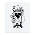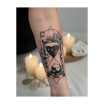Un tatouage détaillé représentant un sablier avec des étoiles et un crâne à l'intérieur. Entouré de fleurs, d'une lune et de formes sacrées, il nous rappelle que le temps passe vite. Son style blackwork lui confère audace et profondeur.
