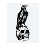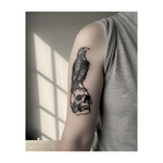 Un corbeau sombre trône fièrement sur un crâne, gardant les secrets de la nuit. Ce tatouage noir exprime mystère et force, tel un observateur silencieux dans l'ombre.