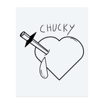 Un cœur transpercé par un couteau, une larme tombant en dessous, et l'inscription « Chucky » au-dessus. Ce tatouage minimaliste illustre un amour sombre avec une touche d'effroi ludique.