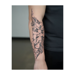 Un tatouage tribal audacieux représentant une tête de lion mêlée à des lignes tourbillonnantes et des fleurs. Le lion symbolise la force, tandis que les fleurs ajoutent une touche de beauté, créant un équilibre entre puissance et sérénité.