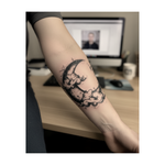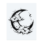 Un doux croissant de lune flotte parmi des nuages duveteux et de minuscules étoiles. Ce tatouage noir resplendit d'une douce magie nocturne, tel un rêve céleste.