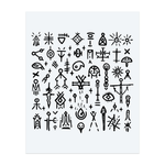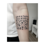 Un mélange de symboles étranges, d'yeux et de formes qui évoquent des signes magiques. Ce tatouage minimaliste est à la fois ancien et mystérieux, comme des runes secrètes venues d'un autre monde.