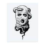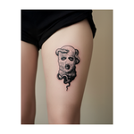 Un tatouage audacieux représentant un masque de ski d'où s'échappent des serpents. Il raconte une histoire sombre de danger, de mystère et de pouvoir occulte, dans un style brut et provocateur.