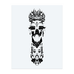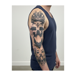Un tatouage tribal sombre aux visages superposés : une couronne de démon en haut, un crâne fondu au milieu et un visage de vampire en bas. Il raconte une histoire de pouvoir, de peur et de transformation.