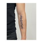 Une ligne de barbelés perçant une pierre fissurée. Ce tatouage noir symbolise la force et la liberté, comme si le mur ne pouvait contenir la puissance qui s'y insinue.