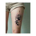 Le visage gracieux d'une femme est encadré par une chevelure fluide et des fleurs épanouies, où lignes audacieuses et pétales délicats se mêlent harmonieusement. Ce tatouage moderne, inspiré d'une esquisse, illustre la beauté, la force et l'élégance dans un style artistique intemporel.