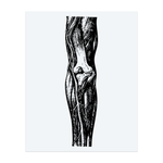 Une jambe dévoile ses os, ses veines et ses muscles par des lignes noires nettes. Ce tatouage noir est à la fois étrange et réel, révélant la structure cachée qui nous maintient debout.