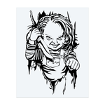 Une poupée effrayante aux cheveux roux flamboyants et vêtue d'une salopette, tenant un couteau avec un large sourire. Ce tatouage noir au style éclaboussé et désordonné rend la poupée encore plus effrayante.