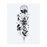 Un moine est assis en méditation, un dragon enroulé s'élevant en dessous, entouré de symboles. Ce tatouage géométrique mêle sagesse, équilibre et force, symbolisant la paix et la puissance réunies.
