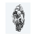 Le visage d'un puissant dieu marin émerge des vagues, un navire voguant dans ses cheveux et une pieuvre géante l'enveloppant. Ce tatouage audacieux raconte une histoire de puissance océanique, de tempêtes et d'aventures dans un style de croquis dramatique.