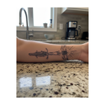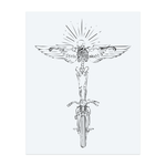 Un squelette aux larges ailes d'ange s'élève du siège d'une moto rugissante, rayonnant d'une lumière radieuse. Ce tatouage au trait symbolise la liberté, la rébellion et la course éternelle de l'esprit et de l'acier.