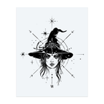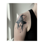 Une puissante sorcière aux cheveux longs et au chapeau haut de forme se tient sous des étoiles scintillantes et des signes magiques. Ce tatouage noir exprime mystère, force et beauté cosmique dans un motif magique.