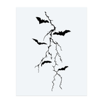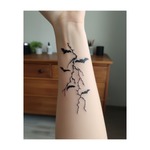 Un tatouage audacieux en noir et blanc représentant des chauves-souris jaillissant de fissures comme des éclairs. Il raconte l'histoire de la libération des ténèbres, mêlant mystère, puissance nocturne et une touche de style gothique.