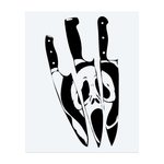 Trois couteaux tranchants reflètent un masque fantomatique dans leurs lames brillantes. Ce tatouage noir mêle horreur et mystère, révélant la peur cachée dans son reflet.