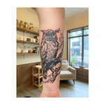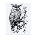 Un hibou sage est posé tranquillement sur une branche tordue, ses yeux perçants brillant de mystère. Ce tatouage noir illustre la force silencieuse et la magie de la nuit.