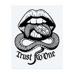 Un tatouage en blackwork représentant des lèvres mordant un serpent, avec l'inscription « Ne fais confiance à personne ». Il évoque le danger et le mystère, mêlant beauté et poison dans un style gothique puissant.