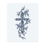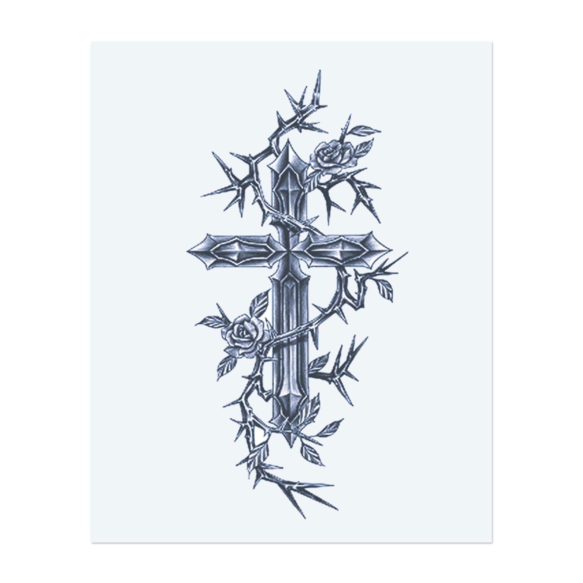 Une croix métallique pointue, entourée de vignes épineuses et de roses en fleurs. Ce tatouage réaliste représente la foi et la force, les épines et les fleurs symbolisant à la fois la douleur et la beauté.