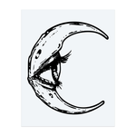 Un tatouage en noir représentant un croissant de lune avec un œil humain dans sa courbe. Il dégage une impression mystique, comme si la lune était vivante et observait, gardant les secrets de la nuit d'un regard calme et magique.