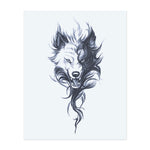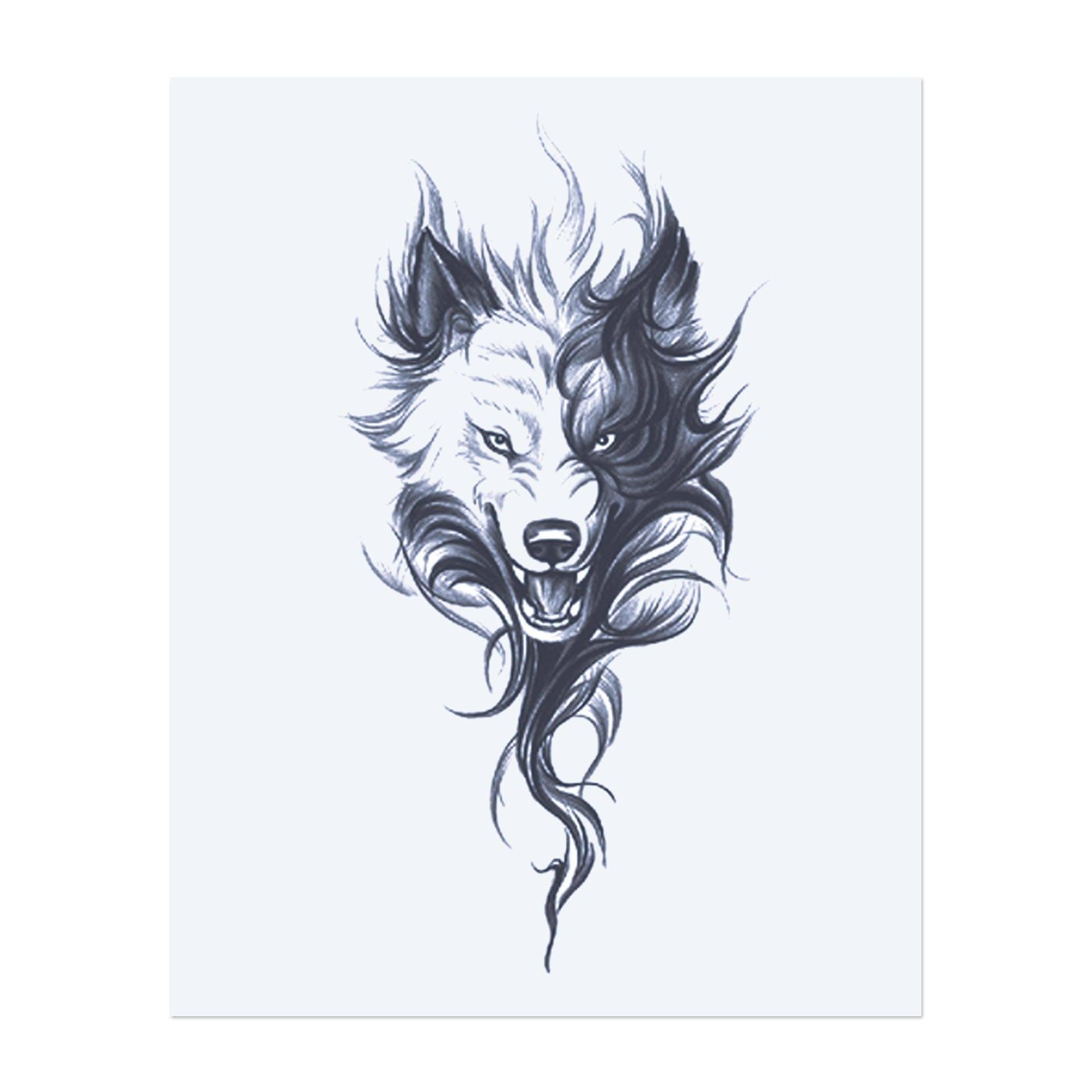 Un visage de loup noir et blanc à la fourrure fluide mêle lumière et obscurité. Ce tatouage réaliste illustre l'esprit du loup, fort et sauvage, prêt à protéger.