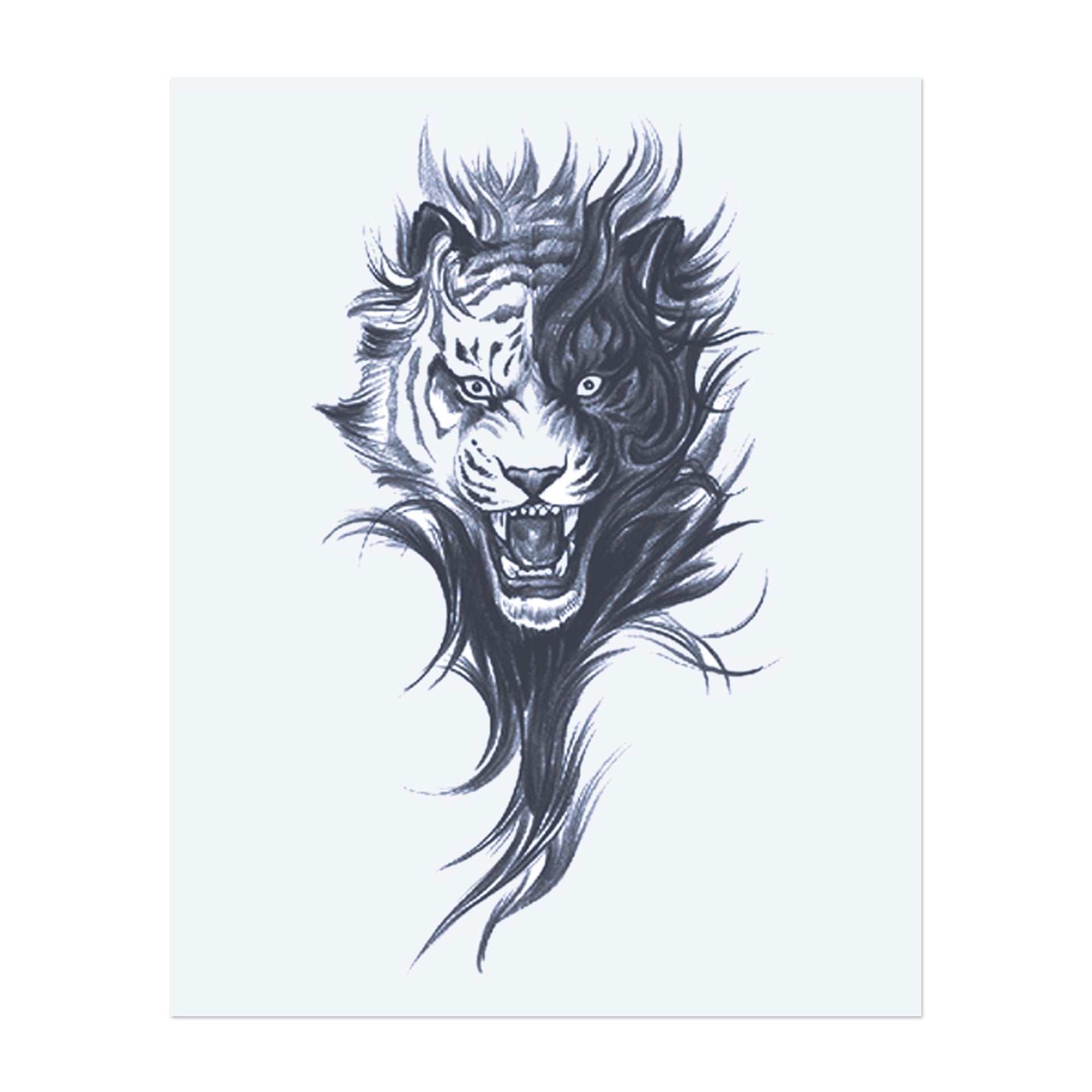 Un visage de tigre noir et blanc rugit, une fourrure de feu s'étalant sur son corps. Ce tatouage réaliste révèle les côtés lumineux et obscurs du tigre, avec un regard perçant prêt à le protéger et à révéler son courage.